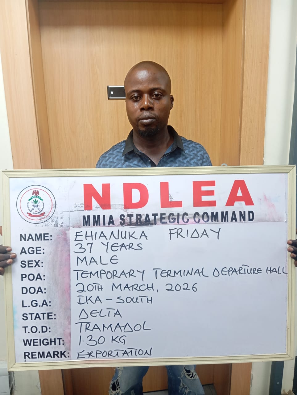 Two of the consignments heading to Italy were to be moved through the Lagos airport where two suspects linked to the shipments were promptly arrested. One of them, 37-year-old Friday Ehianuka was going to Rome, Italy on Friday 20th March 2026 when he was intercepted while attempting to board an Ethiopian Airlines flight with 2,698 pills of tramadol 225mg concealed in containers of skin light body cream, all packed in the suspect’s luggage.