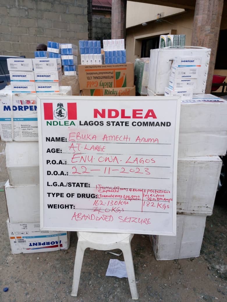 A similar raid in Lagos on Wednesday 22nd Nov. at Enu Owa Street, Lagos Island led to the recovery of 40,500 ampoules of pentazocine injection; 440,000 pills of tramadol in a store belonging to a suspect, Ebuka Amechi who is currently at large. Not less than 135,600 capsules of tramadol and 950grams of cannabis were seized from two suspects: Afamefuna Ibekwe, 37, and Sunday Onweh, 41, at Nkpor, Akuzor and Ose-Ogbaijo, Onitsha, respectively.